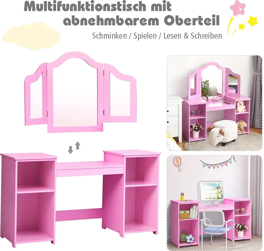 COSTWAY 2 In 1 Kinder Schminktisch Schreibtisch Mit Abnehmbarem Spiegel, Frisiertisch Mädchen Mit Offenen Fächern, Frisierkommode Holz, Schminkkommode (Rosa)