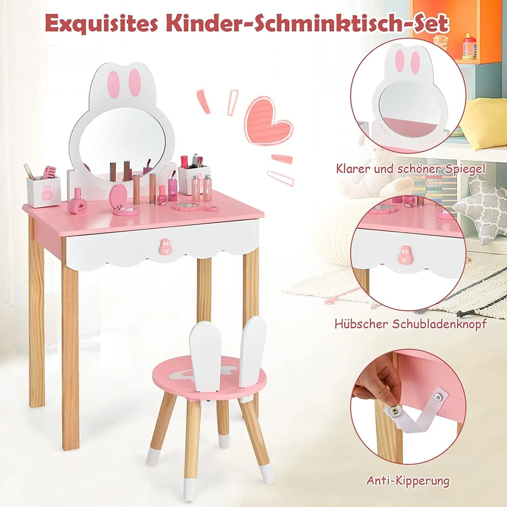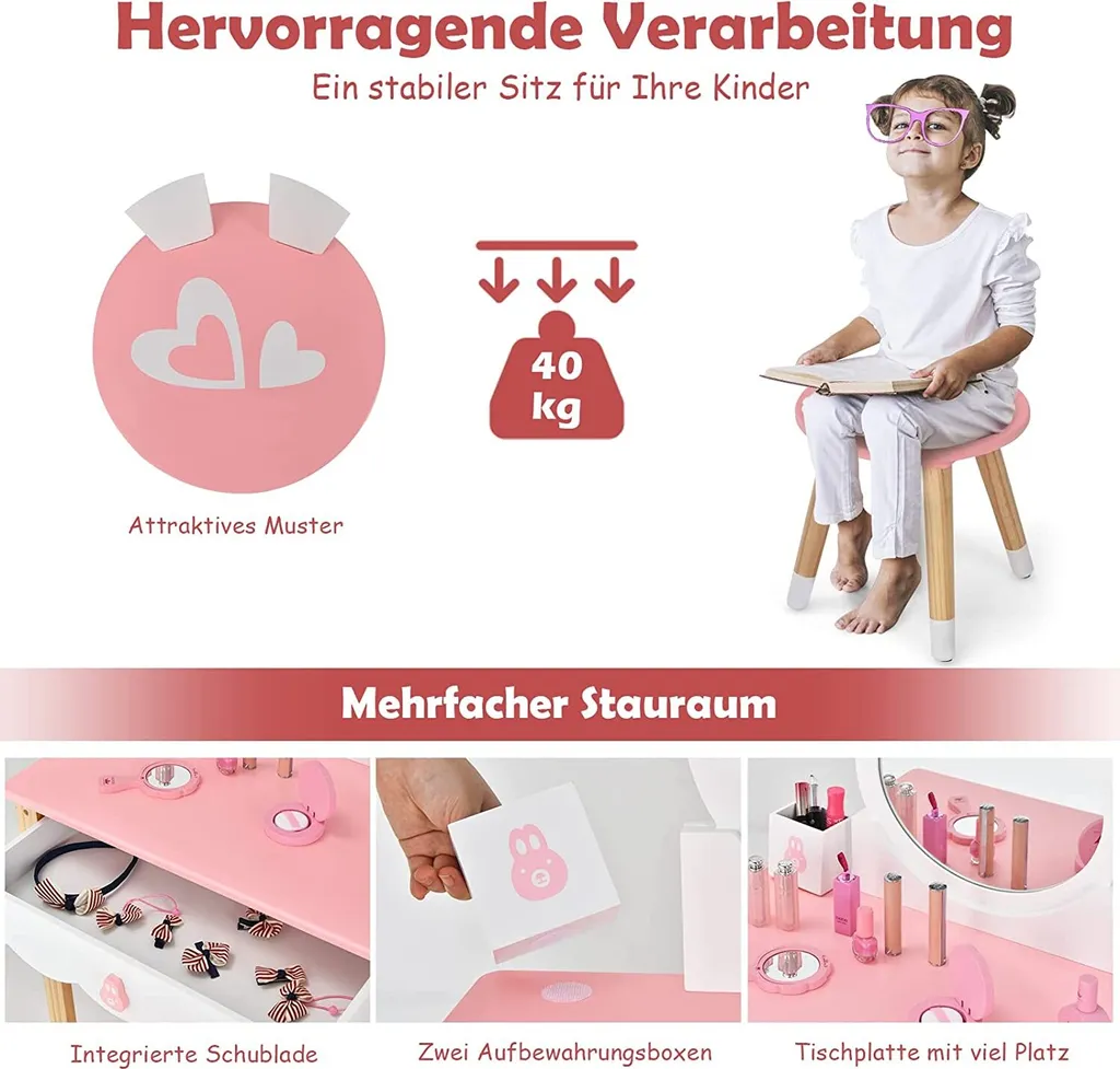COSTWAY Kinder Schminktisch Mit Hocker, Prinzessin Schminkkommode Frisiertisch Mit Spiegel Schubladen & Aufbewahrungsbox, Make-up Schminktisch Frisierkommode Für Kinder Mädchen