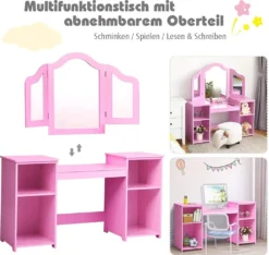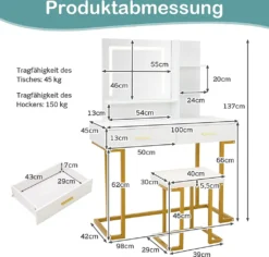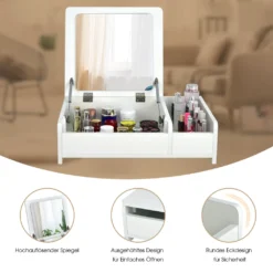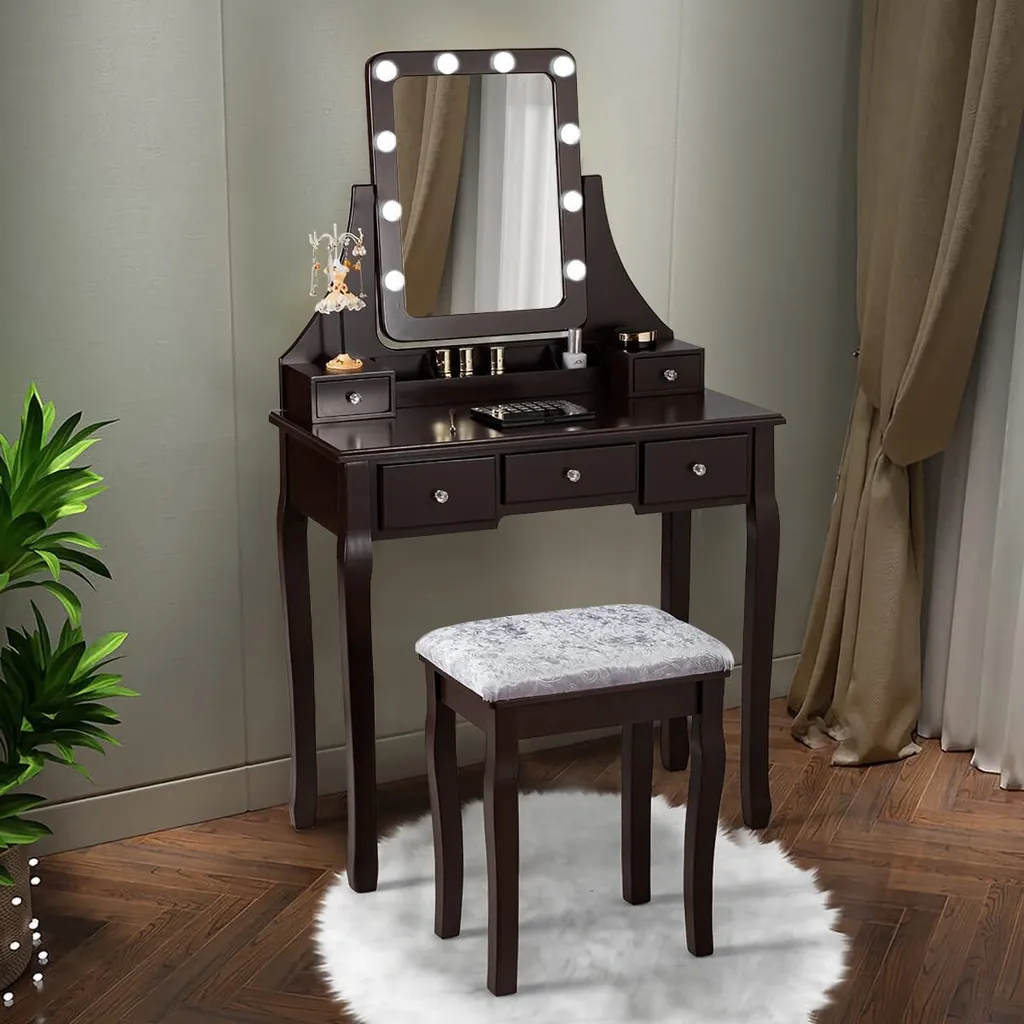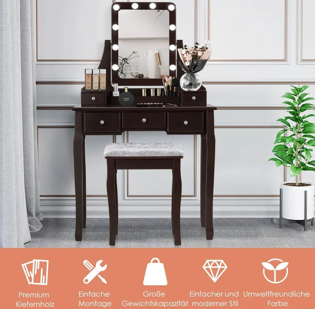 COSTWAY Schminktisch Mit Hocker, 360° Drehbarem Spiegel Und 10 Dimmbaren LED-Birnen, Frisiertisch Mit 5 Schubladen Und Organisator, Kosmetiktisch Aus Tisch Und Abnehmbarer Oberteil (Braun)