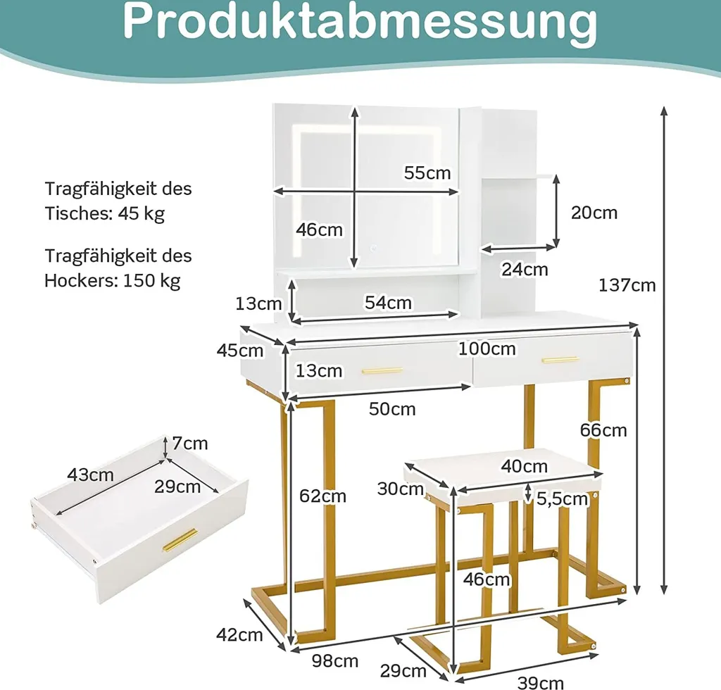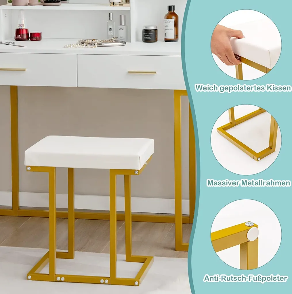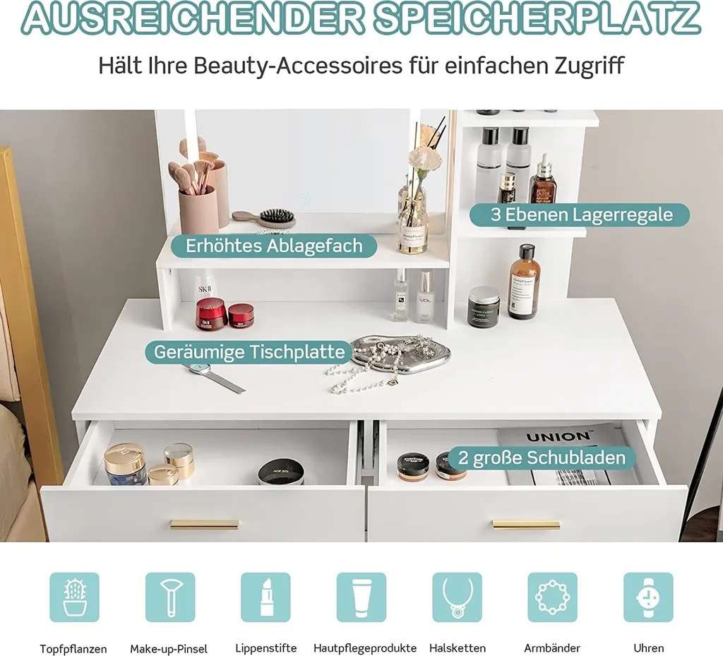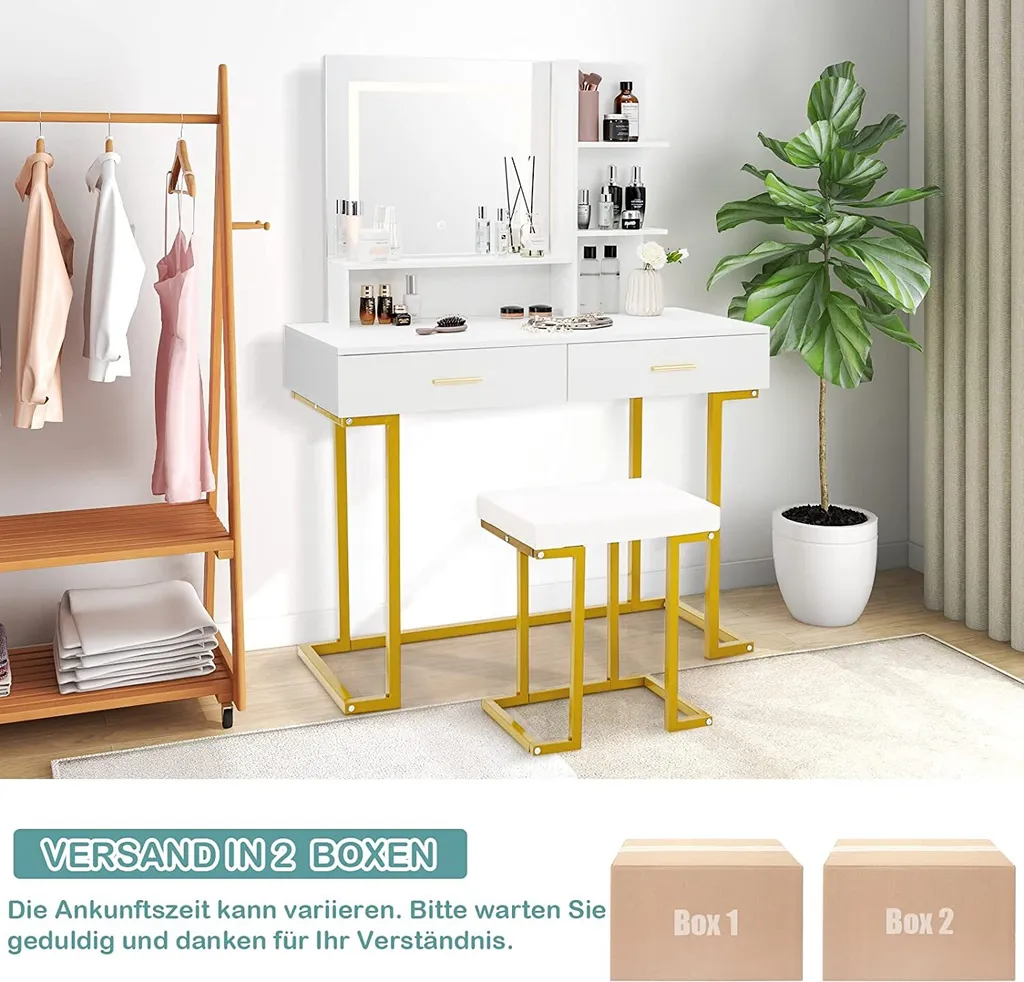 COSTWAY Schminktisch Mit LED Beleuchtung, Großem Spiegel, 2 Schubladen & Regalen, Frisiertisch Mit Gepolstertem Hocker, Kosmetiktisch Für Schlafzimmer, Weiß+Gold