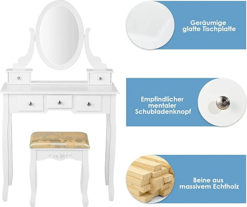COSTWAY Schminktisch Set, Frisiertisch Mit 360° Spiegel Und Hocker, Schminkkommde Mit 5 Schubladen, Kosmetiktisch Gepolsterter Schminkhocker Make Up Tisch , Weiß