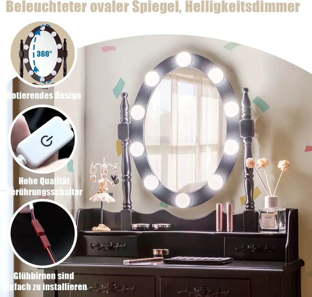 COSTWAY Schminktisch Set Mit 10 LED-Leuchten, Frisiertisch Mit Spiegel Und Schminkhocker, Helligkeit Einstellbar, Kosmetiktisch Mit 4 Schubladen Für Schlafzimmer, Make Up Tisch Holz (Braun)