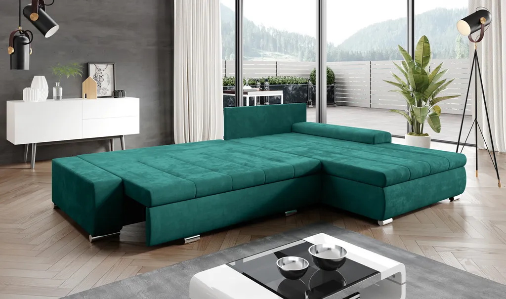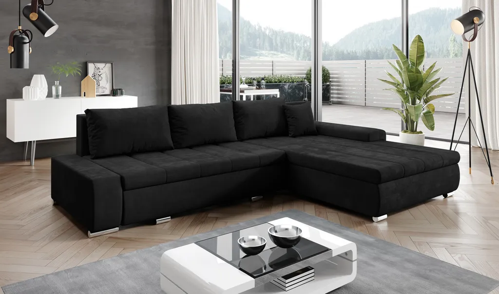 Ecksofa Mit Bettkasten Kastalo – Ecksofa L Mit Schlaffunktion – Samtstoff, Kissen, Couch – Schwarz (Monolith 95)
