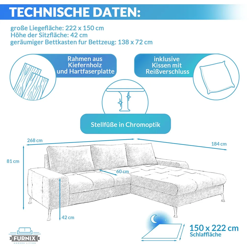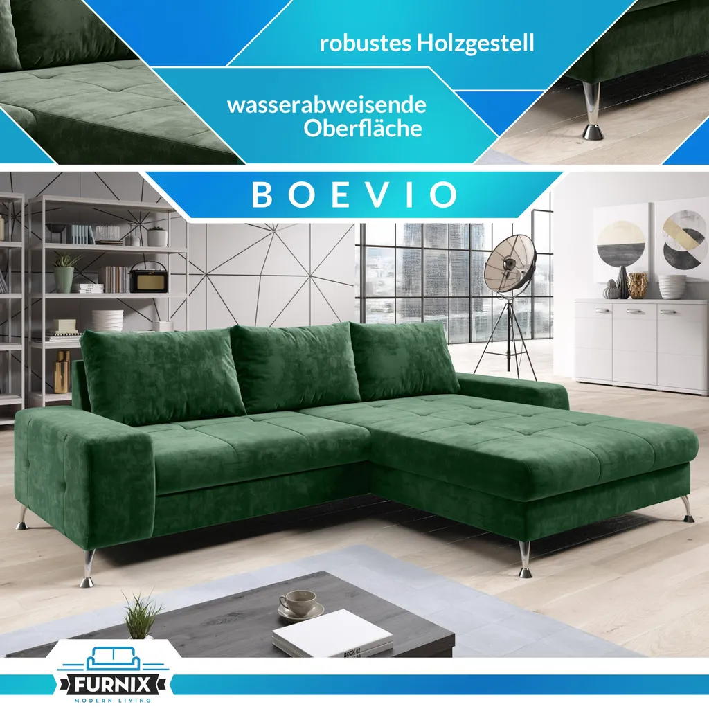 FURNIX Schlafsofa BOEVIO Eckcouch L-Form Couch Sofa Ausziehbar Mit Schlaffunktion Bettkasten Und Kissen MOOS GRÜN KR 14