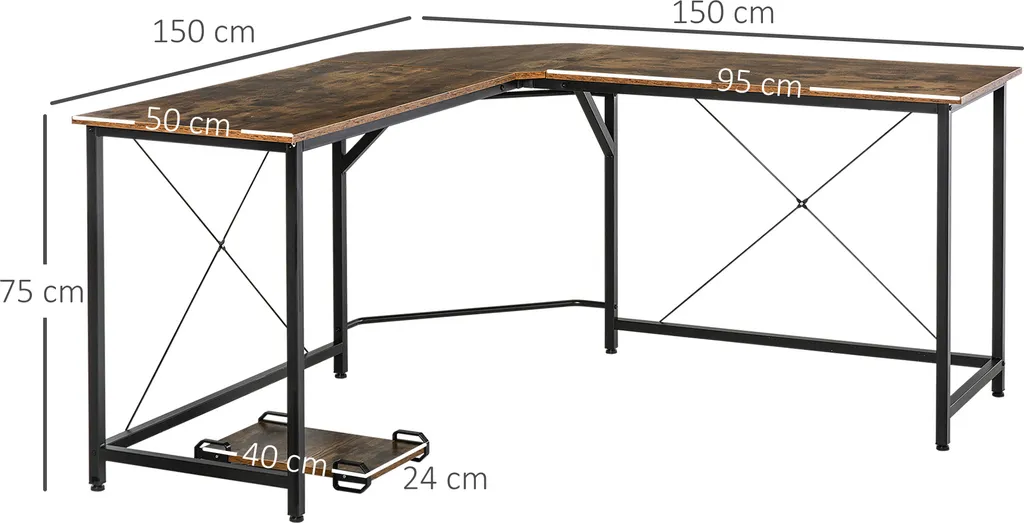HOMCOM Computertisch, L-förmiger Eckschreibtisch, Schreibtisch, Bürotisch, E1 Spanplatte +Metall, Schwarz+Braun, 150 X 150 X 75 Cm