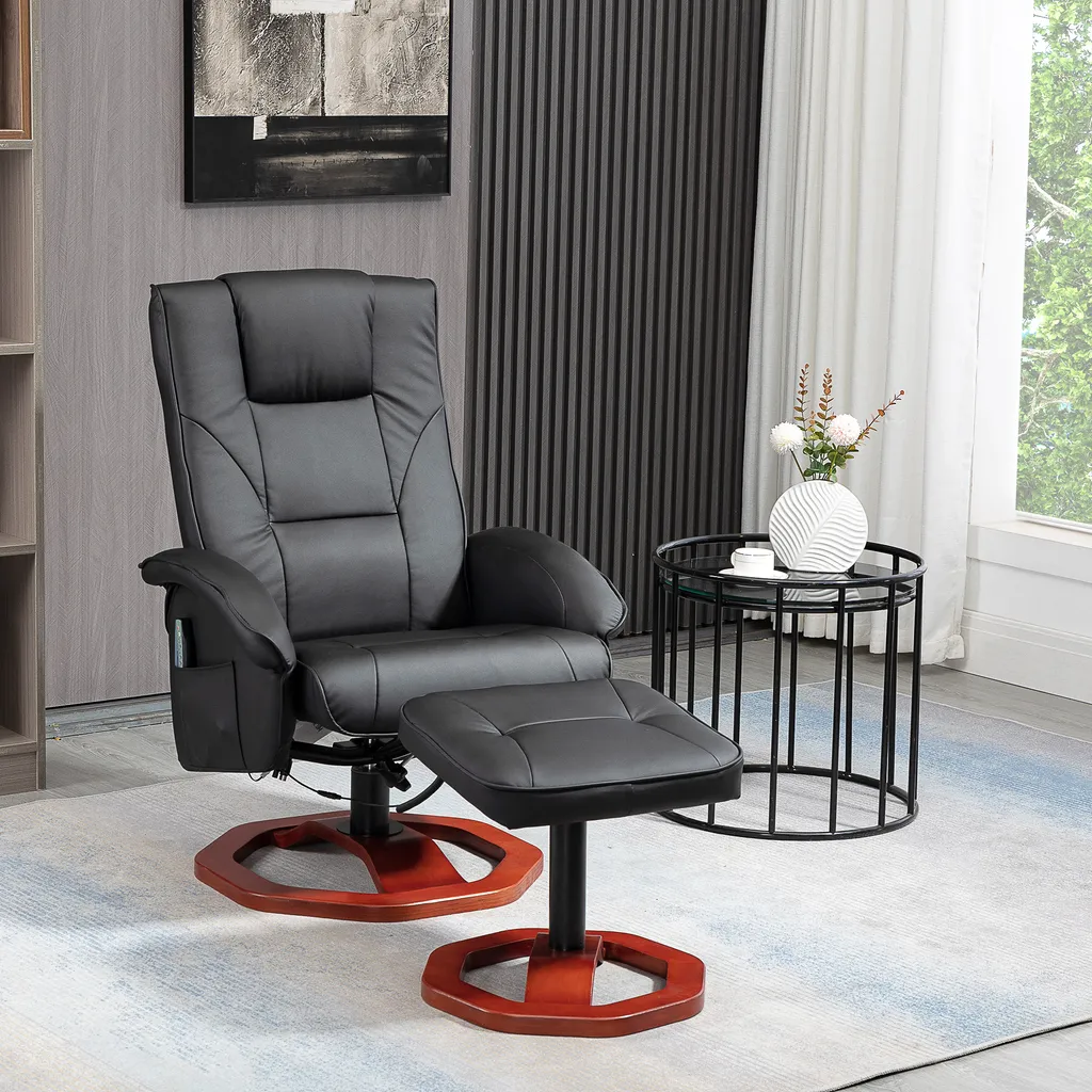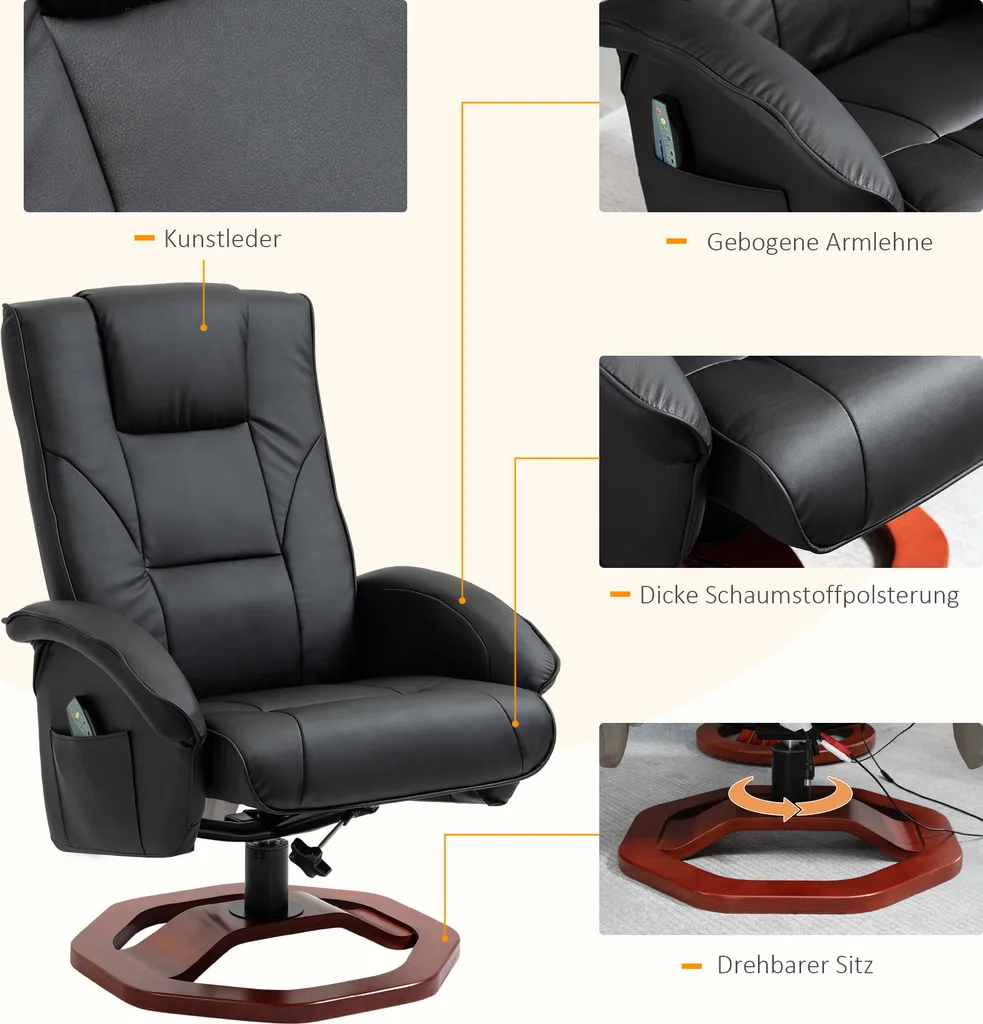 HOMCOM Massagesessel Relaxliege Mit Fußhocker Relaxsessel Liegefunktion Fernsehsessel Liegesessel Mit Massagefunktion 360° Drehbar Kunstleder Stahl Schwarz+Braun 73 X 83 X 106 Cm