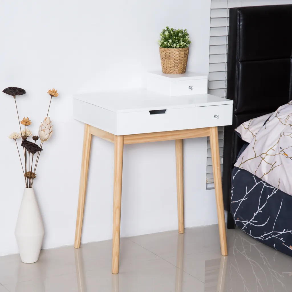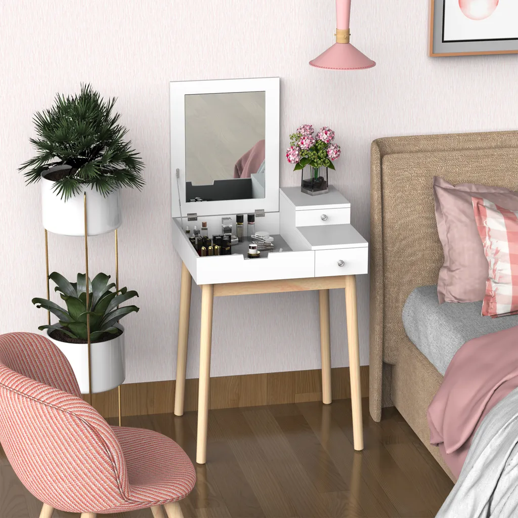 HOMCOM Schminktisch Frisiertisch Kosmetiktisch Mit Aufklappbarem Spiegel Holzfüße Weiß 60 X 50 X 85,5cm