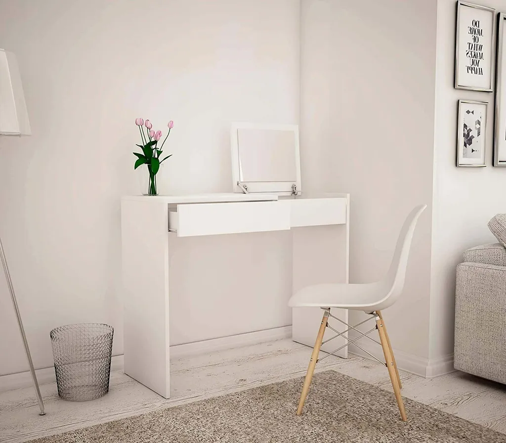 MATKAM Opera Schminktisch H 78 X B 96 X T 40 Cm, Mit Ausklappbarem Spiegel H 21 X B 34 Cm Mit Gasdruckfeder Metallscharniere (Weiß)
