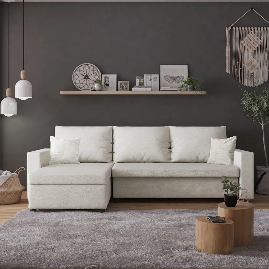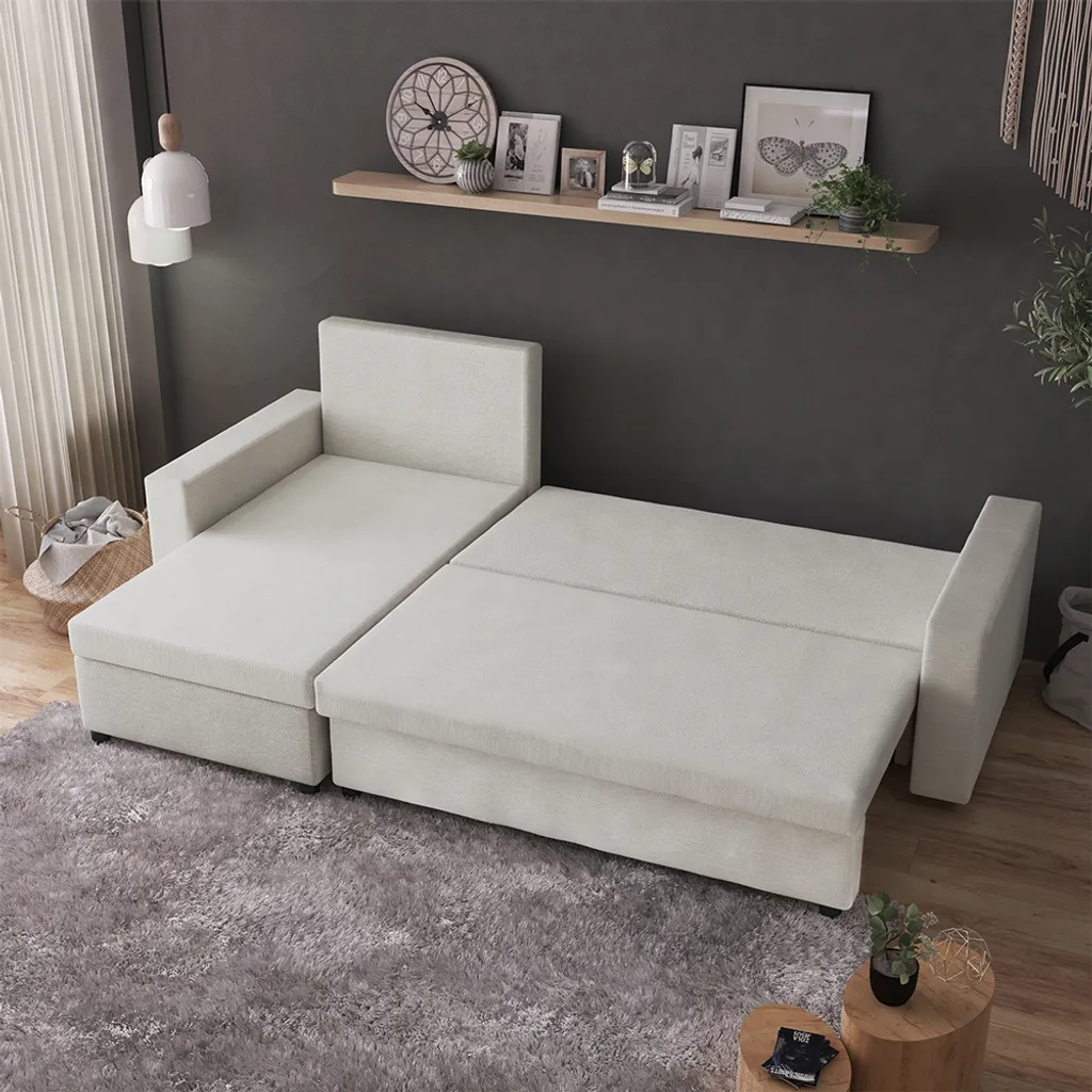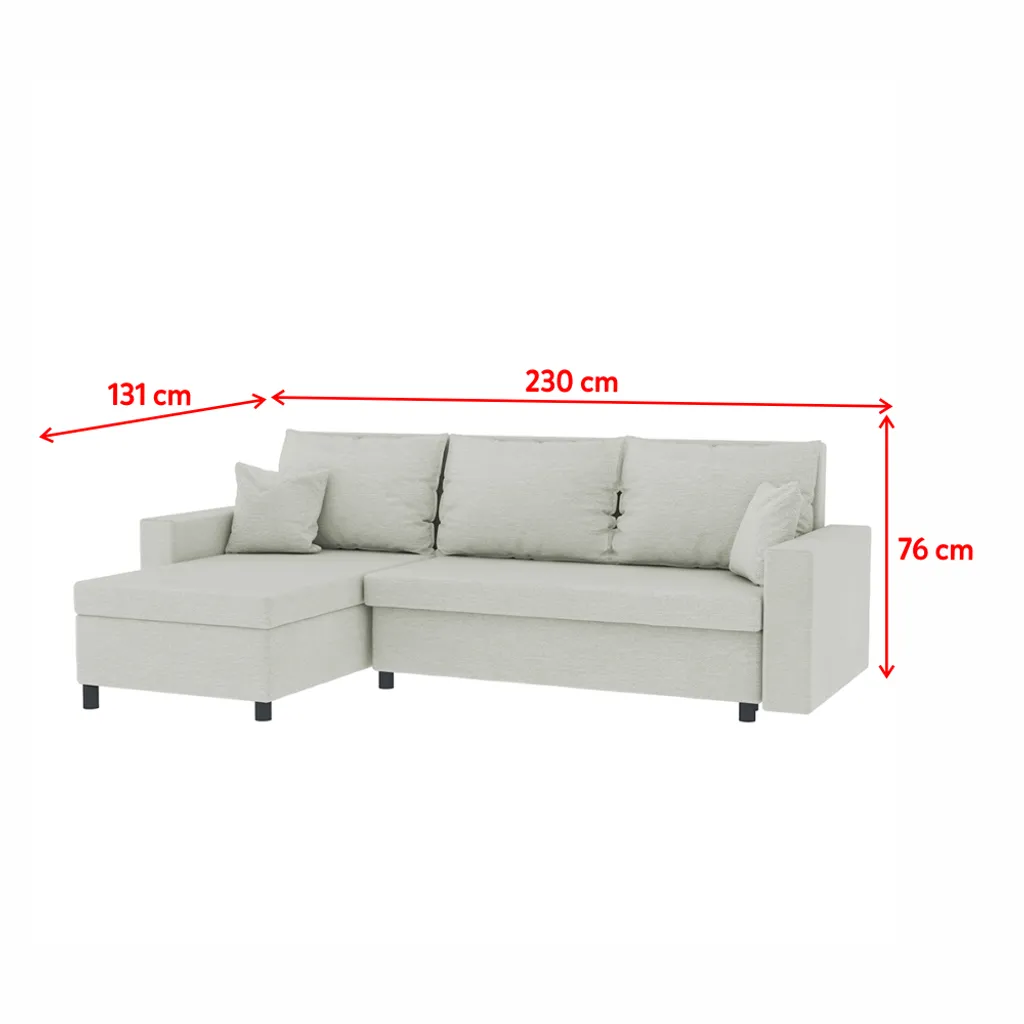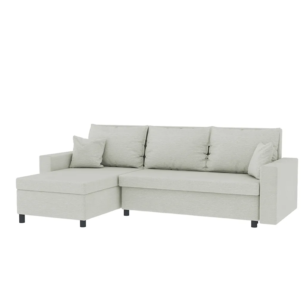 Selsey Ecksofa DERDURA – Schlafcouch Mit Wasserbeständigem Veloursbezug In Melange Creme, Bettkasten, Ottomane Beidseitig Montierbar, 230 Cm Breit
