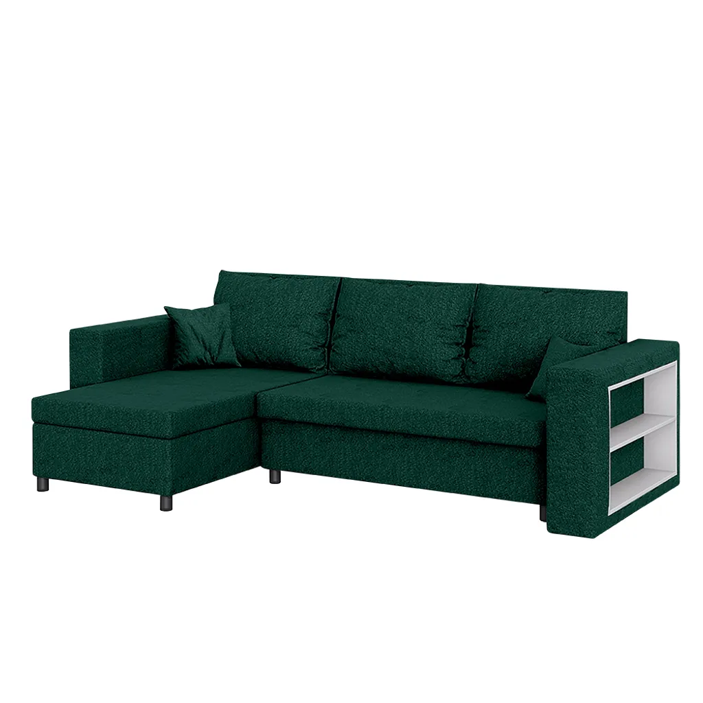 Selsey Ecksofa MERIEN – Schlafcouch Mit Wasserabweisendem Veloursbezug In Dunkelgrün, Bettkasten Und Integriertem Regal, 230 Cm Breit
