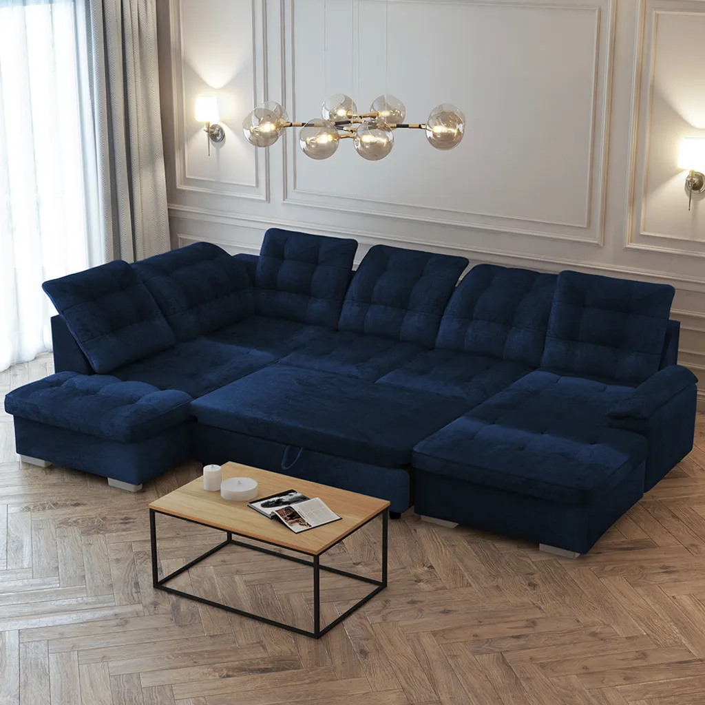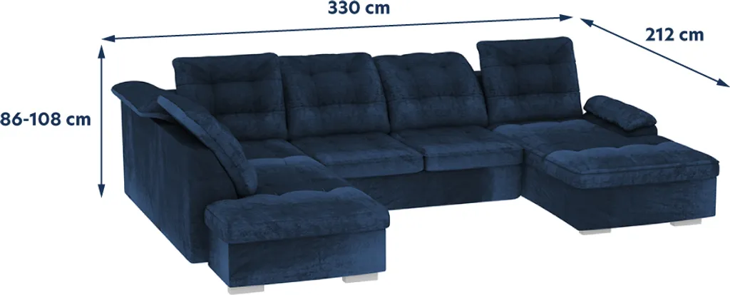 Selsey JAMAAL U – Schlafsofa In U-Form Dunkelblau, Ottomane Rechts, Mit Regulierbarer Rückenlehne, Bettkasten 330 Cm