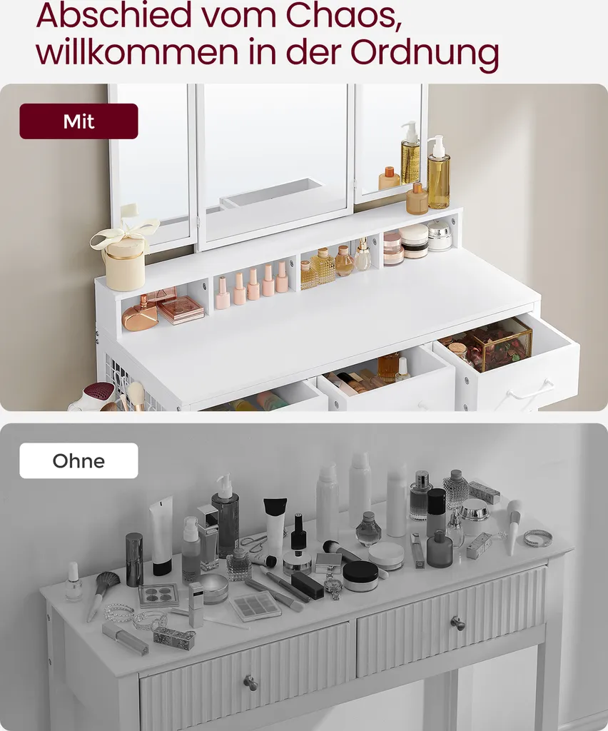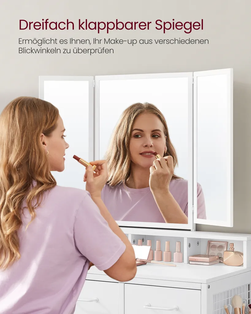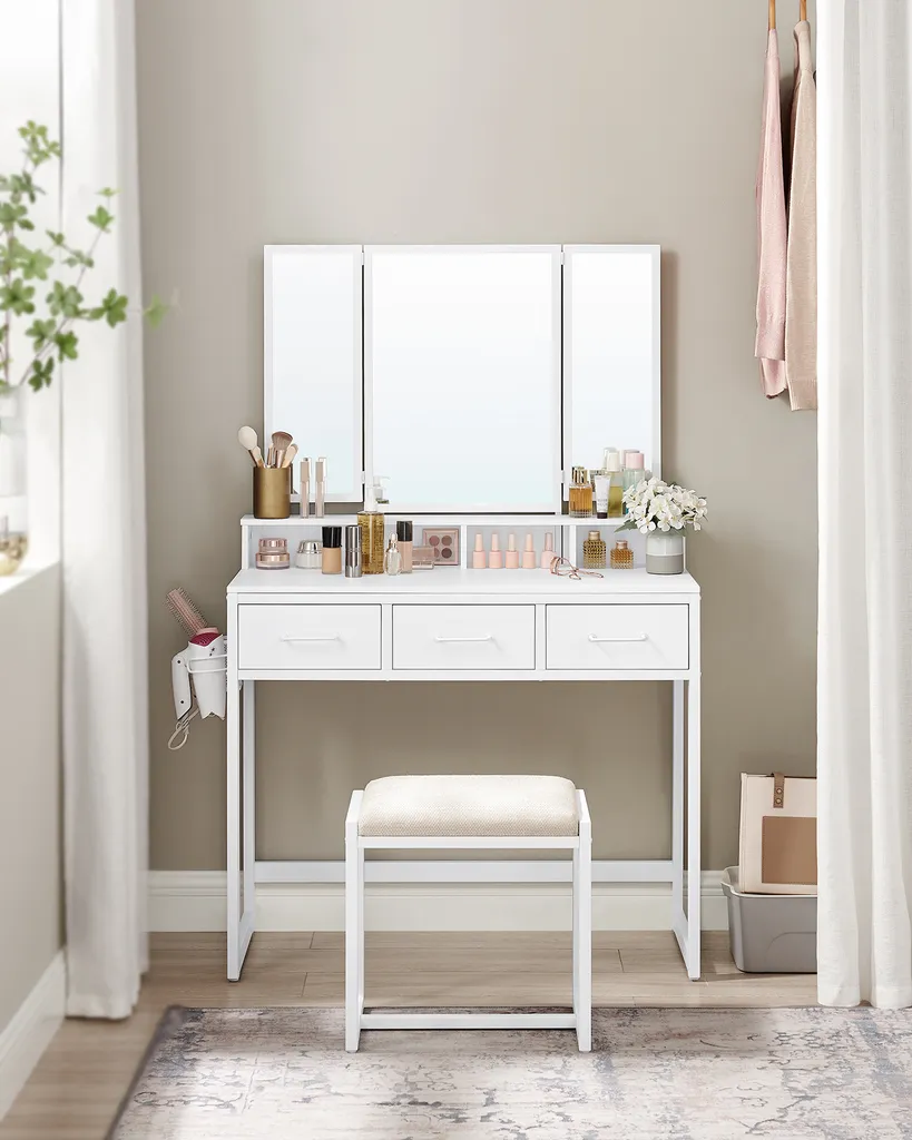 VASAGLE Schminktisch Mit Gepolstertem Hocker, Frisiertisch Mit Dreifachem Spiegel, 3 Schubladen, Haartrocknerhalter, Kosmetiktisch, Moderner Stil, Weiß RVT004W14