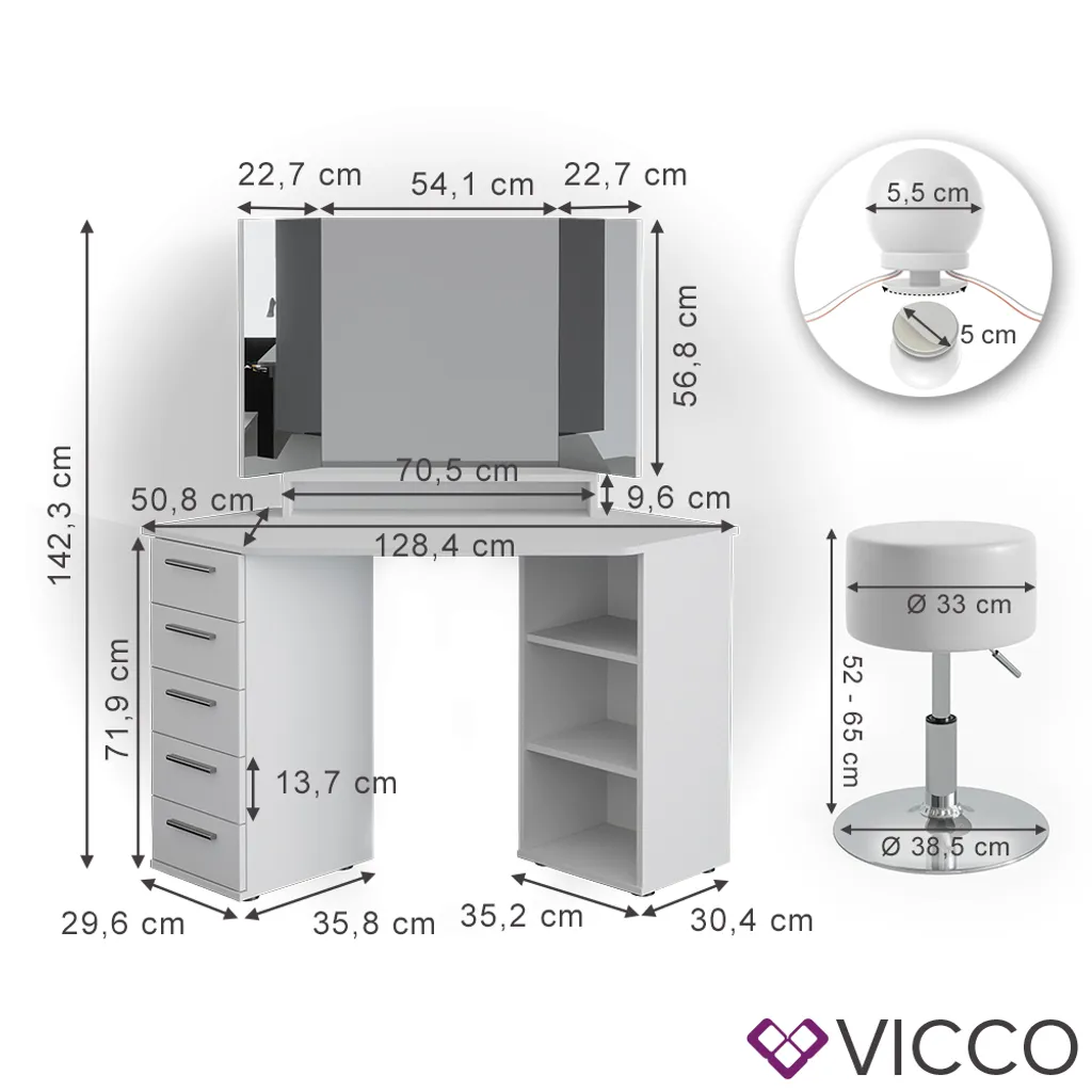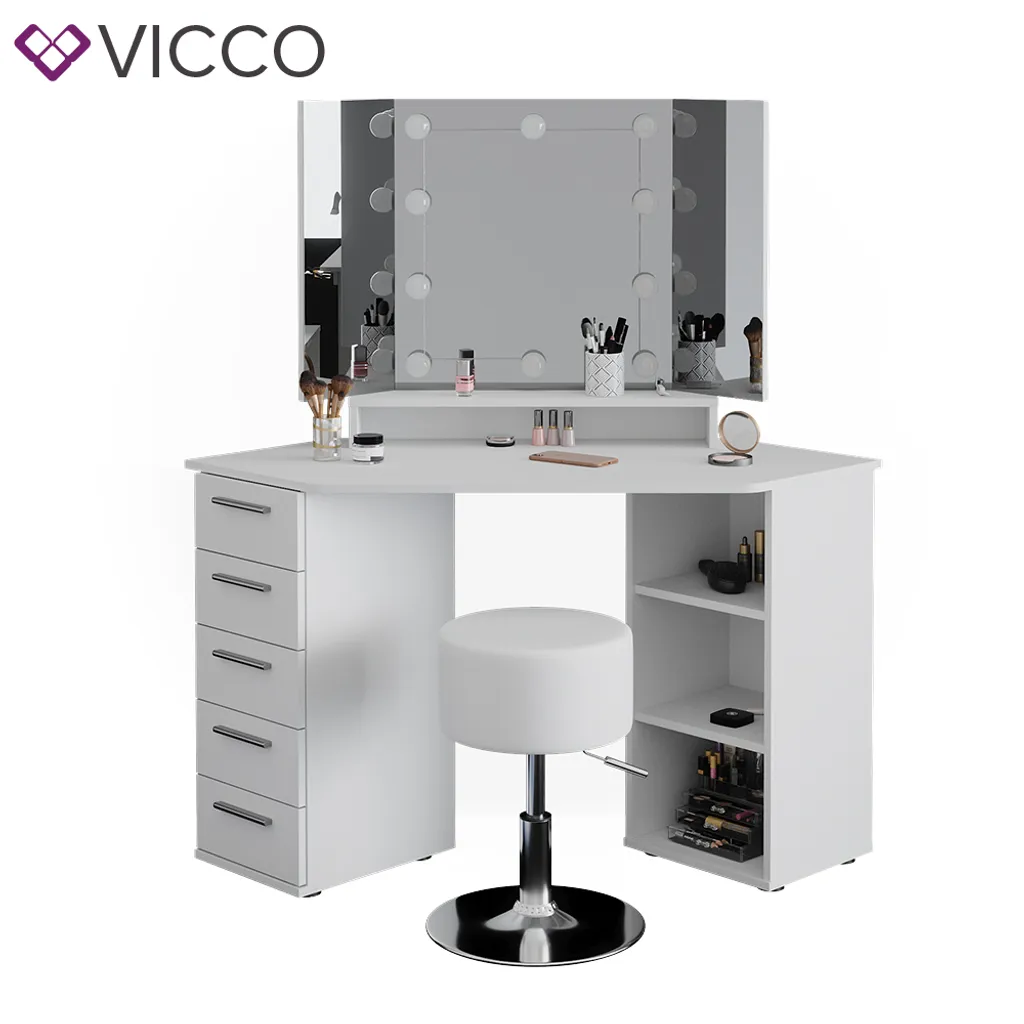 Vicco Eckschminktisch + LED + Hocker Sofia Weiß 128,4x 42,3×50,8cm Holzwerkstoff