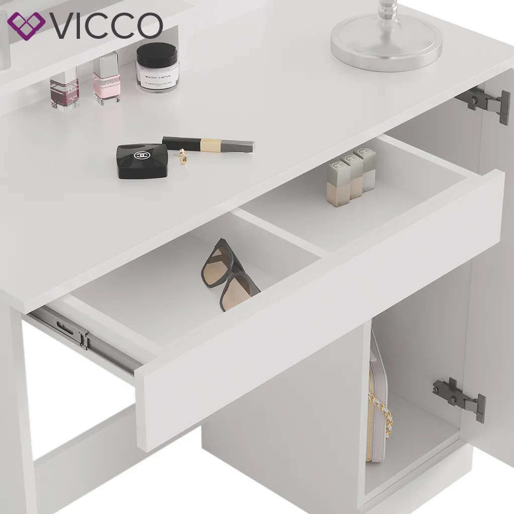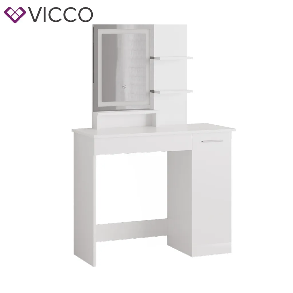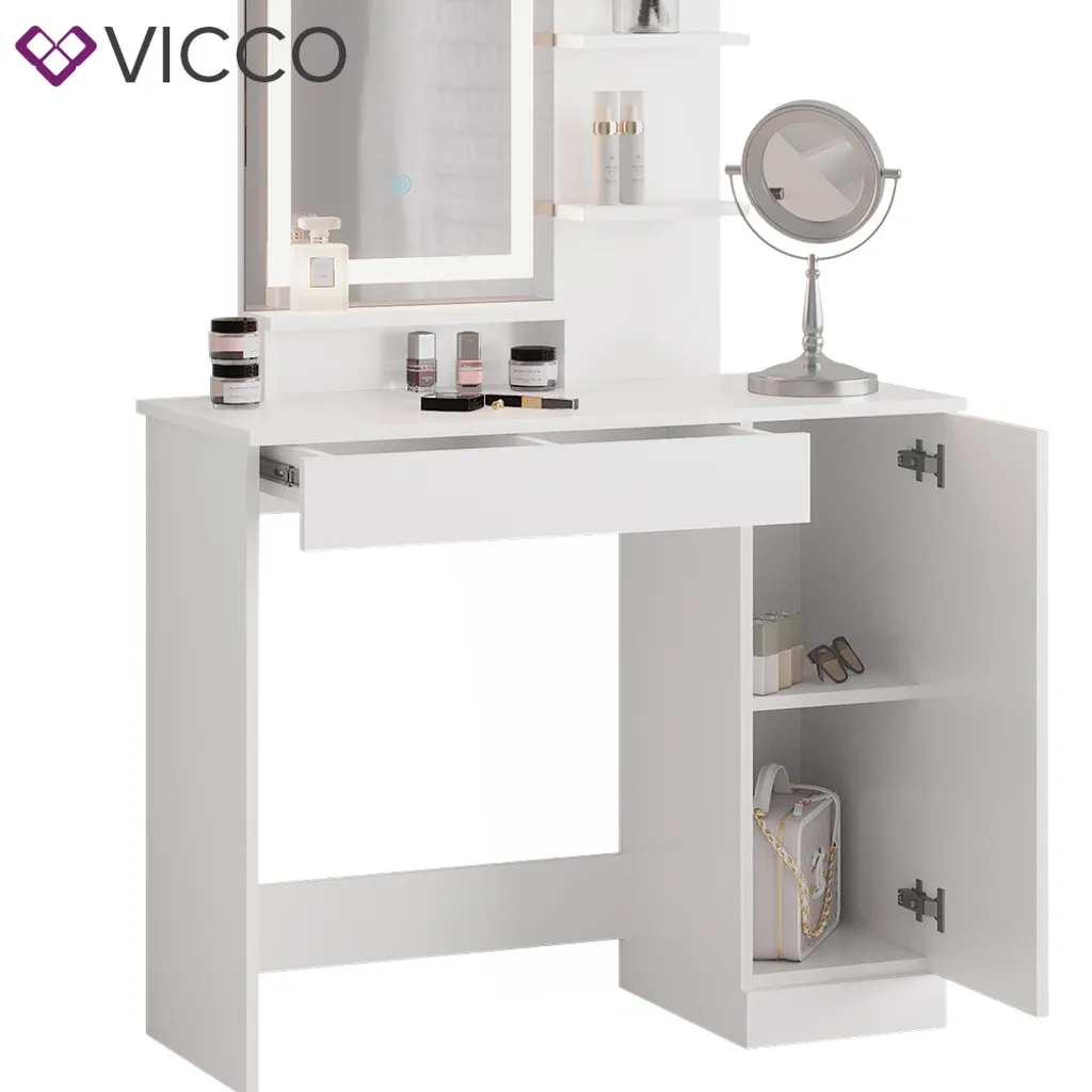 | Zusätzliche Varianten | Vicco Schminktisch + Hocker + LED Ruben Sonoma Weiß 100 x 150 x 42 cm Holzwerkstoff, Vicco Schminktisch+Hocker+LED Spiegel Dekos Weiß 75 x 141 x 40 cm Holzwerkstoff, Vicco Schminktisch + LED Spiegel Julia Weiß 90 x 137,5 x 38 cm Holzwerkstoff, Vicco Schminktisch Dekos + LED Spiegel Weiß 75 x 141 x 40 cm Holzwerkstoff |